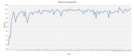 Övrigt: Fick punka på framhjulet ca. 400 m hemifrån. Det smällde till och däcket tömdes omedelbart, så det var bara att bromsa, kliva av cykeln, stänga av pulsklockan och gå den sista biten hem. Jag hade även lite strul med bakväxeln precis då jag startade, så jag fick kliva av hojen och motionera växeln lite. Den kärvade, så det är nog en rundsmörjning som behövs. Men den funkade iaf. ok under resten av passet.