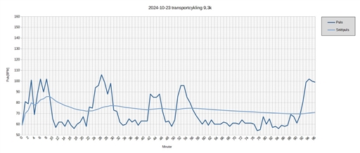 Snittpuls under cykling: (103*(9+8/60)+89*(8+24/60)+81*(4+43/60)+88*(5+51/60)+88*(6+21/60))/((9+8/60)+(8+24/60)+(4+43/60)+(5+51/60)+(6+21/60))=91 BPM