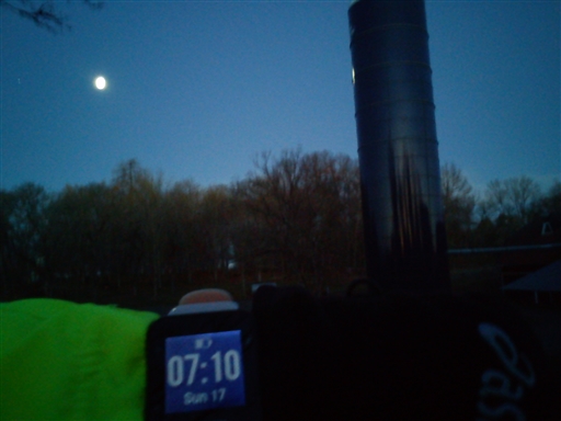 Ut lite senare, mörkt o blåsigt. Genom byn o ner mot sjön. Upp o genom hagarna, månen o Silva gav bra ljus. Ut på andra sidan, ljuset kom o vid Ledinge hängde månen fortfarande kvar o ljuset speglade sig i silon 🙂 fortsate grusvägen hemåt.