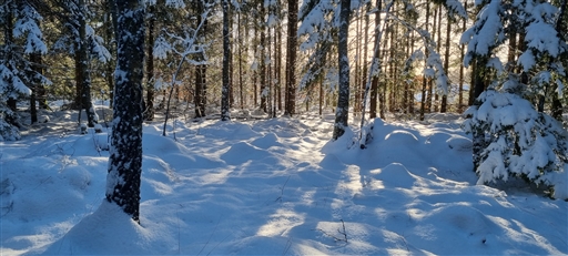 Utforskar skogen lite längre bort från stigen. Går riktigt bra trots 10-15cm snö. Soligt och skönt.