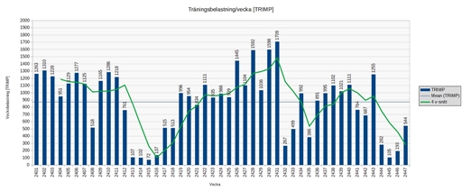 Efter tre kassa veckor träningsmässigt, då jag varit småkrasslig, har jag senaste veckan börjat smyga igång med träningen igen. Fortfarande på ganska beskedlig belastning jämfört med årssnittet på drygt 870 TRIMP/vecka, men ändå över 4 v-snittet, som sjunkit ned till 280 TRIMP/vecka efter den här veckan.