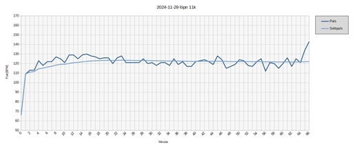 Jag sprang till det lokala spåret, sen två varv runt det + 1,5 bonus-km i spåret, sen tillbaka hem igen. Jag tyckte det var lite trögt att få upp pulsen under de första 2,5 kilometrarna, då jag låg ca. 4 BPM back. Under nästa 2,5k-etapp ökade jag intensiteten något för att hamna på ca. 120 BPM i snitt efter det. Sen var det mest en historia av att ligga kvar på 120 BPM i snitt under resten av passet. Jag ökade på intensiteten lite under sista etapperna, då jag försökte ligga på 121 BPM i snitt, men det var först på slutet av sista etappen som totalsnittet i klockan ändrade sig från 120 till 121.