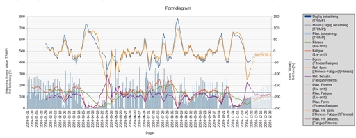 Formen (den blå kurvan) har inte varit överdrivet låg under veckan utan hållit sig på rätt sida om -50. Rel. form (orange) har dock varit oroväckande låg. Likaså har rel. belastning varit oroväckande hög. De senare två är dock av mig påhittade mätetal, så jag vet inte riktigt hur relevanta de är.