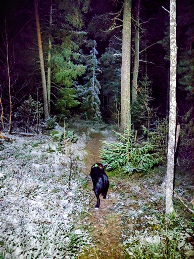 Nellie glad över minusgrader. Mysigt i skogen som vanligt men fortfarande rätt geggigt på sina ställen.