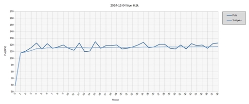 Jag sprang till spåret, sen ytterligare 1k i spåret, vände och sprang tillbaka samma väg jag kom. Målet med dagens pass var att få ihop till ca. 44 TRIMP (0,75 ggr det dagliga 4 v-snittet). Jag hade hoppats kunna springa på i snitt 120 BPM, men det kändes lite trögt och tungt i dag och jag orkade inte forcera. Det fick bli som det blev.