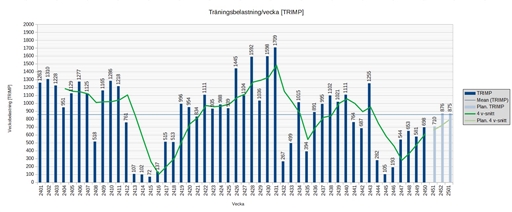 Det känns bra så här långt. Nästan så jag funderar på om jag ökar för långsamt. Men det är lätt att få hybris då det känns bra. Bättre att skynda långsamt tänker jag. Med den här takten, ca 10% ökning per vecka i snittt, är jag uppe över mitt årssnitt (f.n. ca. 860 TRIMP/vecka) inom ett par veckor och kan förhoppningsvis fortsätta att öka vidare från den nivån i början av 2025.