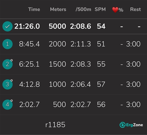 2000 m/1500 m/1000 m/500 m. 3 min vila mellan. Kort nedvarvning.