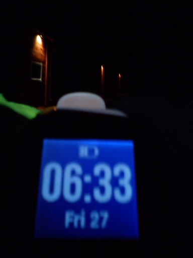 Ut I tidig morgon, 7 plusgrader o vindstilla. Friskt luft o bltt på marken. Genom byn o ner mit sjön, inte så många bilar ute, kanske pga klämdag idag? Upp o genom hagarna, blött o kladdigt. Ut på andra sidan, mötte två vanliga bilar, rejält blött o halkigt på grusvägen, riktigt obehagligt ute i kanten, höll på att hamna i diket. Ljuset kom så sakta när haj sprang över E4.
