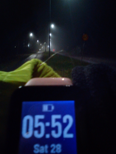 Ur I tidig morgon, vindstilla, blött o ett väldigt dis. Genom byn o ner mot sjön, duset kändes nästan som lätta droppar. Upp o genom hagarna, körigt o geggigt, svårt att se I skenet från Sikva. Ur på andra sidan. Grusvägen ännu blötare idag, kryssade fram mellan vattenpölarna, lyckades oricka ett par o fick mig ett kallt fotbad. Tidningsbudet enda bilen jag mötte denna mörka morgon.