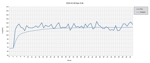 Pulslogg: Det ser ut att vara något knas i början på kurvan. Jag började springa direkt, men klockan har inte registrerat någon större pulsökning de första 2 minuterna. Skumt!