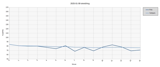 Inte så hög puls. Strax under normal promenadpuls (78 BPM) i snitt. Tror det skulle kunna vara ännu lägre om jag inte kört så tätt inpå löppasset. I går då jag stretchade noterade jag att pulsen låg i intervallet 61-77 BPM under stretchingen.