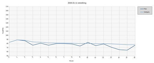 Det vanliga programmet. Körde inomhus direkt då jag kom hem. Jag körde återigen efter klockan och med mätning av puls för att få lite uppfattning om hur jag ligger till med TRIMP-poäng från stretchingen. Det rör sig bara om storleksordningen 3-6 TRIMP, men alla bäckar små. Det som avgör snittpulsen här är nog hur mycket pulsen har hunnit gå ned efter passet innan. Om jag kör direkt i anslutning till föregående konditionspass blir snittpulsen och TRIMP-värdena högre än om jag haft en längre paus mellan föregående aktivitet och stretching.