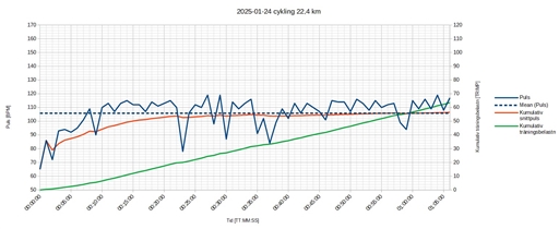 Jag cyklade relativt lugnt. Målet var att försöka ligga på ett snitt på 107 BPM (65%) under passet, vilket gick bra till sist, även om det inte var förrän på slutet som jag kom upp i den kumulativa snittpulsen.