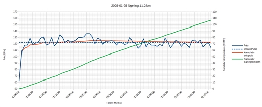Målet med passet var att få ihop ca. 94 TRIMP (100 med stretchingen) och att springa ca. 68 min på 120 BPM snittpuls (72-73%). Det blev ytterligare 1 BPM och några minuter mer.