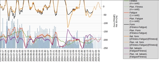 Som syns av formdiagrammet är Fitnesskurvan (grön) på väg upp, Fatigue (röd) och Form (svart) ligger inte på några katastrofala nivåer och även Relativ belastning (lila) och Relativ form (orange) ligger på rätt beskedliga nivåer.