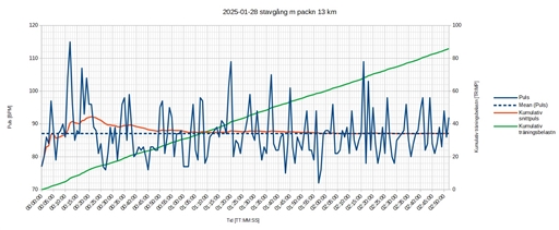 Ryggsäcken vägde ca. 32,8 kg. Jag hade bl.a. en vattendunk med 25 liter vatten. Jag kände mig väldigt trött i axlarna i dag, efter någon timmes stavgång. Jag behöver helt klart öva mer på att gå med tung packning. Dock ville pulsen inte komma upp i dag, så jag fick hålla på mycket längre än förväntat för att komma i närheten av TRIMP-målet för passet, som var 93 TRIMP.