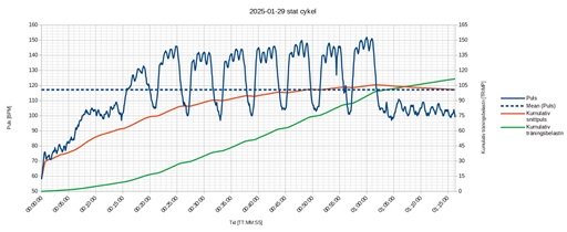 Energiåtgång: Min egen uppskattning är att jag förbrukade ca. 853 kcal under passet. Detta baserat på formeln f(x)=10x-500 kcal/tim. Det ger (10*117-500)*(76+23/60)/60=853 kcal. Enligt pulsklockan förbrukade jag 828 kcal, baserat på 91 kg. Morgonvikt 90,80 kg. Men pulsklockan räknar bara tiden då pulsen är högre än 90 BPM, så då fattas det ca. 6 minuter i början på passet.