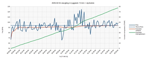 Snittpuls från stavgång: (91*(57+58/60)+96*(29+58/60))/((57+58/60)+(29+58/60))=93 BPM