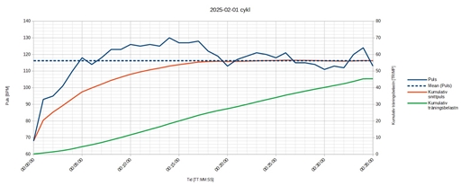 Rampade upp belastningen lite försiktigt de första 5 minuterna, tills jag kom upp till nivå 9, som ska motsvara ca. 253 W @ 90 RPM. Sen låg jag kvar där till ca. 17 min in i passet, då den kumulativa snittpulsen hade kommit upp till min målnivå, som var ca. 116 BPM (70% av HRmax).