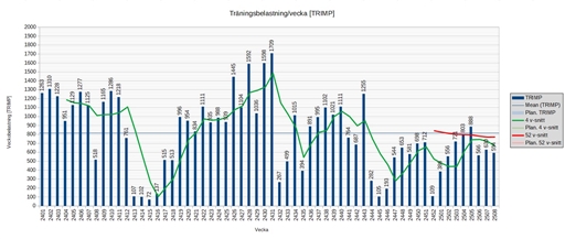 Från onsdagen har jag bara tagit en dag i taget och försökt att komma i balans, både v.g. träningsbelastning och energi. Inte gjort några heroiska insatser v.g. träningsbelastning utan bara gnetat på ungefär på den genomsnittsnivå jag ligger på nu, eller något över. Jag har haft 4v-snittet som ribba. Jag har även tagit det lite lugnare med energiunderskotten. Min tanke nu är att inte ha större underskott än max ca. 500 kcal/dag.