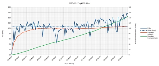 Jag körde utan energi och vätska. Jag hade inte räknat med att passet skulle bli så långt, utan bara ca. 90 minuter. Men pga den låga pulsen och den tröga kroppen fick jag sikta på att vara ute längre för att få ihop till ca. 104 TRIMP, som var målet. Jag vände efter 73 min, då min kumulerade snittpuls var 99 BPM. Jag hade räknat ut att jag skulle behöva köra ca. 146 min på den intensiteten för att få ihop till 104 TRIMP.