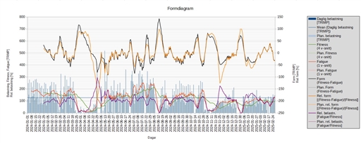 Det rullande 7-dagarssnittet (röd kurva i formdiagrammet) för den genomsnittliga dagliga belastningen (efter dagens aktiviteter = 128,6 TRIMP/dag) ligger för första gången på länge över medelvärdet (127,5) för perioden sen 2024-01-01 och fram till i dag (blå vågrät linje i diagrammet).