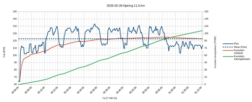 På slutet reagerade pulsen bra mycket snabbare. Det tog kanske 35 sekunder att få upp pulsen från 115 till 132 BPM och drygt 10 sek. fr. intervallet 132-140 BPM ned under 132 BPM. Sen kanske ytterligare 20 sek. ned till 115 BPM.