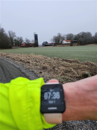 Ut straxt efter kl 06, -2 grader o en disig gryning. Genom byn o ner mit sjön. Upp o genom hagarna, krispigt o hårt i marken. Ut på andra sidan, såg dovhjortar o förmodligen jägare i ett par bilar som sakta körde om mig. Hjortarna var på sin vakt o sprang fort iväg in i skogen. Hemåt o mötte ett par hundägare när jag närmade mig hemmet.