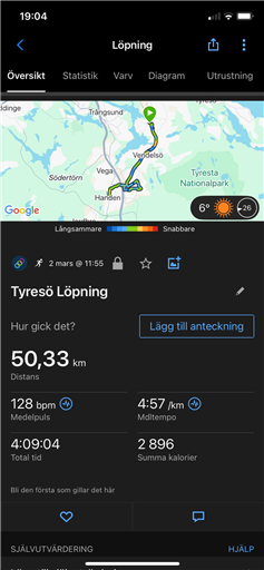 Stabil känsla i dag dock lite sega baklår sista milen men kompenserade det genom att släppa belastningen på baklåret och koppla in rumpan istället vilket gav ett bättre löpsteg med lite högre knälyft. Skall springa premiärmilen den 29 mars så kommer köra färre riktigt långa pass och istället springa lite snabbare.