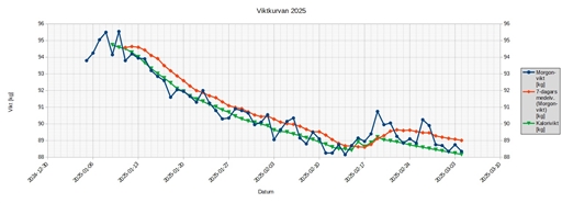 Jag får vara uppmärksam på detta under kommande dagar och försöka känna efter vad som händer i kroppen. Jag ligger på ca. 500 kcal/dag i kaloriunderskott sen flera dagar tillbaka och jag misstänker att det är det som är en stor bidragande orsak till tröttheten. Dock står jag fortfarande och stampar v.g. vikten. Jag tycks ha hamnat på någon slags platå.