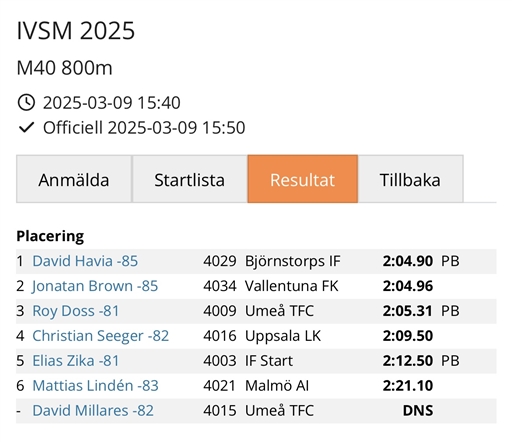Sprang offensivt men hamnade sist med lucka direkt efter första kurvan. Trodde kanske att jag skulle få sällskap en bit men kände mig nöjd med farten. Fortsatt trycka med en tanke om att några framför kan ha öppnat för hårt. Blev ett sololopp men lyckas plocka en gubbe på slutet. Trycker med vad jag har med 250m kvar men hade underlättat om jag haft sparring där.