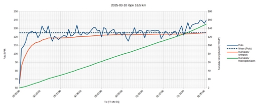 Bra flyt i dag. Återhämtad enl. pulstestet på morgonen och kroppen kändes ok, då jag väl kom igång, även om jag inte var nå taggad innan och jag hade en viss motvilja att ge mig ut i det trista vädret. Responsiv puls. Det var länge sen det kändes så här bra att springa. Det kändes som att jag kunde ha fortsatt i samma tempo ytterligare en bra stund.