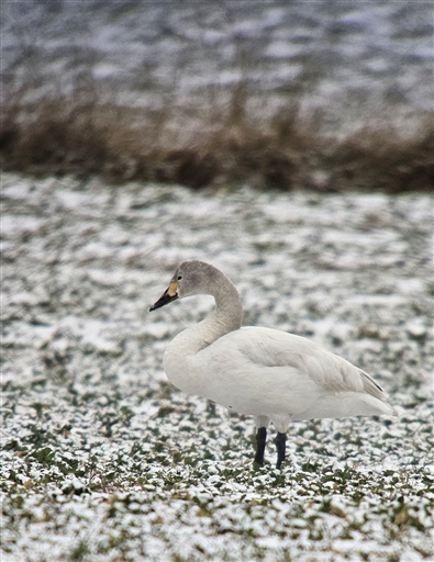 1 mindre sångsvan bland 140 sångsvanar och många grå- och kanadagäss.