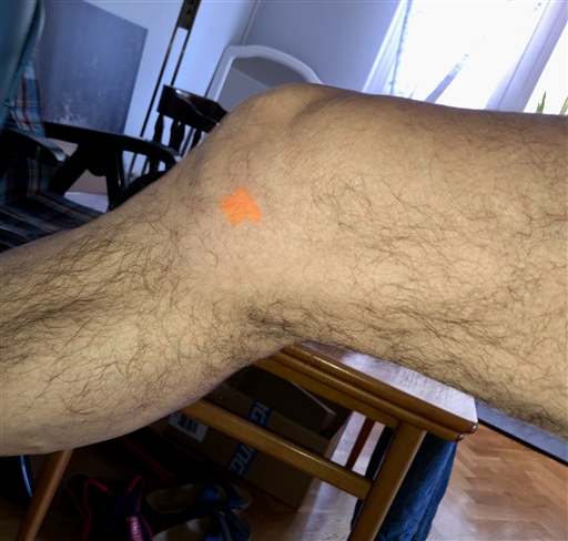 Från i fredags den 14e, mest smärta vid orange märke, ont i en 6 cm omkrets mest åt lårets sida.