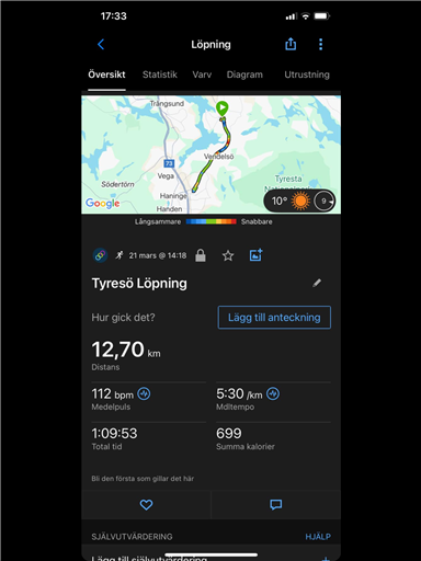 typ, distans, tid och snittfart. Stjärnmedlemmar kan kopiera samtliga fält och diagram.