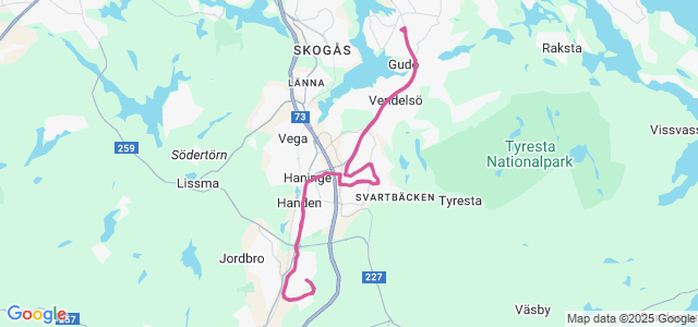 Förbi jordbro via vendelsömalmsskolan och Brandbergens centrum och samma väg tillbaka igen