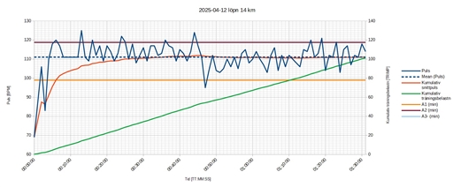 Problem med pulsloggningen de första ca. 15 minuterna. I loggen fanns många felaktiga värden, allt från 0 BPM till 148 BPM under dessa första ca 2,5k. Jag gjorde en del justeringar i pulsdiagrammet och tog bort/medelvärdesbildade över vissa sampel för att få den någorlunda rimlig.