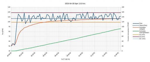 Jag sprang till det lokala motionsspåret, sen tre varv runt + 1,5 bonuskm i spåret, sen hem igen. Jag var riktigt trög i kroppen i dag. Benen var stumma och jag hade problem att få upp både puls och tempo. Troligen nedtränad efter några träningsdagar på raken. Detta trots att klockan indikerade att jag var återhämtad enl pulstestet på morgonen.