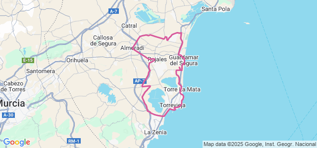 Längs kusten först, Guardamar till La Marina. Sen in i landet till Dolores och Almoradí. Lunch. Via Rojales och Benijófar till Los Montesinos. Sen standardavslutning till Torrevieja. 26º, småblåsigt - alltså ganska varmt!