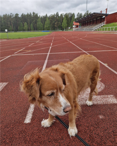 På IP. Jag passar lånehunden den här veckan så hon fick vara med och ligga i gräset och titta på när jag vallade. 5*400m och 8*200m. Fart typ 1:36 och 43s. Det känns som jag blivit bättre på långdistans men förlorat fartresurserna. Vi får väl se om jag kan skaka liv i påkarna igen.