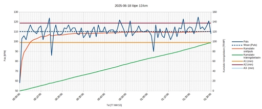 Övrigt: Jag fick stanna tre ggr för att uträtta behov, 2 ggr nr 1 och 1 gång nr 2. Mage och blåsa inte vana med löpning. Jag pausade klockorna samtidigt som jag pausade.