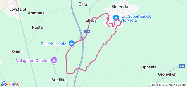 En variant på Brovarvet med en extra sväng i början så att jag kunde skippa långa uppförsbacken över tågspåret. Annars så kändes det bra, och andra halvan gick undan i medvinden. Fast när jag funderade över hur jag skulle komma över 15 km glömde jag stänga av klockan (15:e km). Efter en dusch och lunch började det regna. Bra timing om jag får säga det själv.