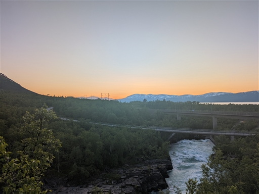 Vi gick upp på en kulle, men solen gömde sig bakom ett berg. Topparna omkring oss var dock solbelysta.