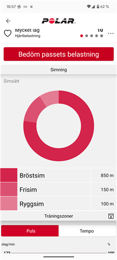 Men min klocka har gått loss ordentligt och ambitiöst värre! Den bedömer att jag simmat 800 meter! Eller tom 1100? Dessutom gör den en bedömning av simsätt: jag har tydligen förutom bröstsim även tagit mig an frisim och ryggsim. Där ser man. Inte visste jag att jag kunde sånt?