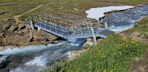 737 m nedförs. Ok ben o knän. Flera snöfält idag också. Och några där det inte gick att följa spåren för det var djupa sprickor eller inga spår alls. Spännande, nästan som långfärdsskridskor 🤩 Även häftig terräng längst in i dalen, klippväggar, avsatser och höga vattenfall. Sen flackare med orkidéängar och behaglig vandring. En intressant bro piggade upp när jag slövandrade som bäst ...