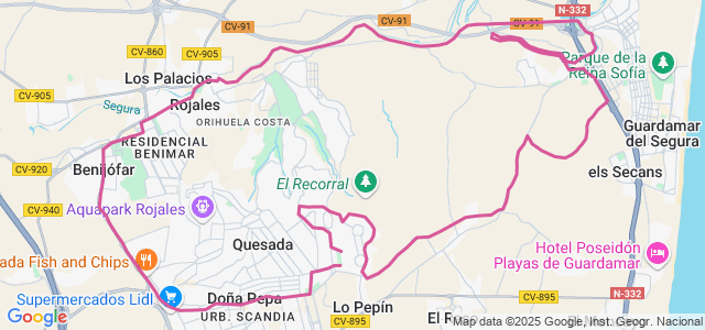 Mycket kraftig motvind till Guardamar. Tog ytterligare en uppförsbacke p rundan på grusväg. Obehagligt att cykla nedför då farten var ganska hög och det var lite rullgrus på vägen. Svalare idag efter nattens regnväder. Fick köra slalom mellan vattenpölar.