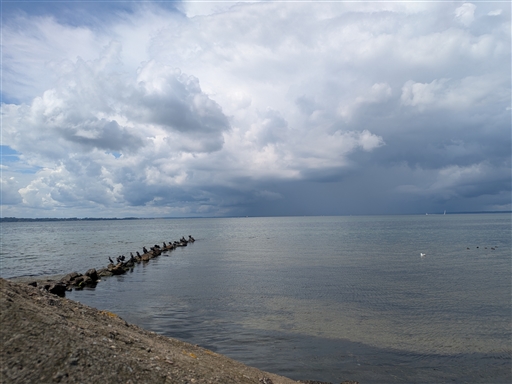 Tåg till Landskrona, buss till Borstahusen. Start vandring längs kusten norrut. Blev snabbt väldigt varmt, tryckande värme. Mycket vackert med utsikten över Öresund, Ven och Danmark. Mörka åskmoln vi horisonten.