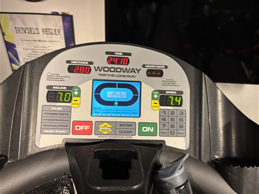 Hamstring og kne må fortsatt ikke løpes med, virker det som, så da ble det motbakkegang på mølla på jobben. Kjørte 7,0 i incline og økte tempoet etter hver kilometer.