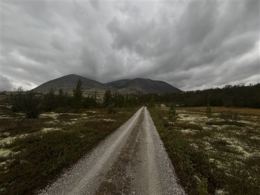 Deretter retur via fjellveien (ca 5 km) - og etterhvert ned stien vi aldri fant i fjor (og da holdt på å gå oss bort). Relativt lett terreng jf oppstigningen. Nydelig utsikt til Høgronden som ruvet over oss under truende skylag. Deretter lett match tilbake til Straumbu.