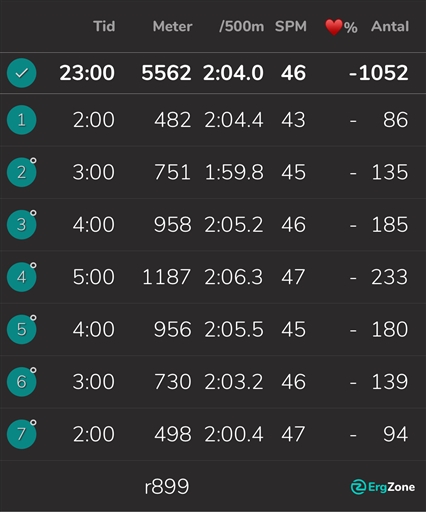Intervaller 2-3-4-5-4-3-2 min, 2 min vila mellan. Nedvarvning.